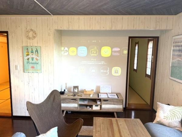 【居間・リビング】落ち着いたナチュラルなテイストのリビングが魅力の空間です。壁面のプロジェクターがリビングをより一層機能的に演出します。木材の温かみを感じるインテリアが居心地の良さを引き立てています。
