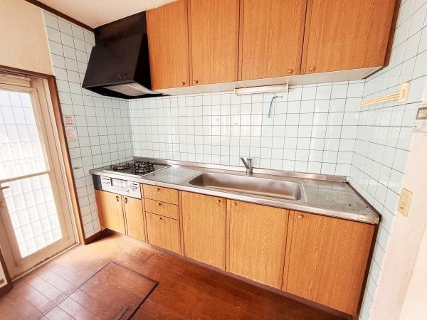 【キッチン】木目調の収納が特徴のキッチンです。壁一面のタイルが清潔感を演出します。