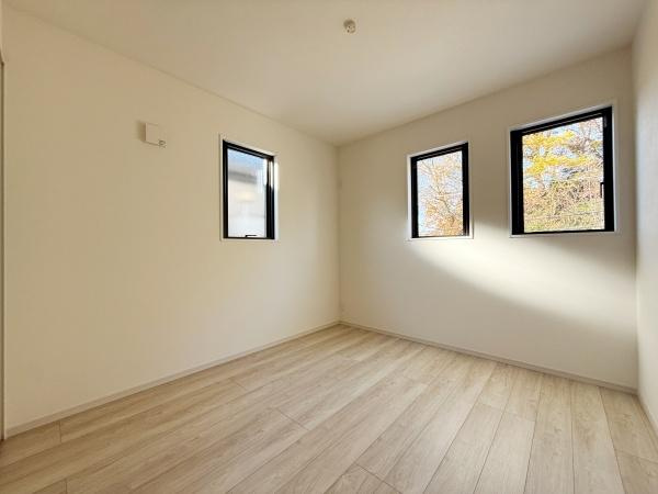 【洋室】シンプルな内装で落ち着いた印象の洋室です。2面に窓があり外からの光を感じられます。フローリングが明るくすっきりとした空間です。余計な装飾がなく自由にレイアウトを楽しめます。