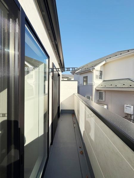 【バルコニー】バルコニーは手すりが設けられておりしっかりとした造りです。ガラス戸からの採光があり室内への光の取り入れにも貢献します。空が広がる開放感のある空間です。建物同士の距離感を感じることができます。