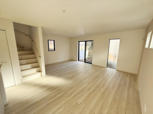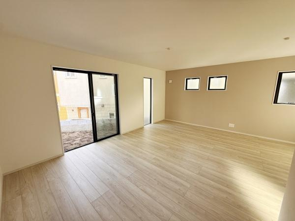 【居間・リビング】リビングは広々とした空間が特徴です。明るいフローリングが室内をより開放的に見せています。窓からの自然光もたっぷり入ります。シンプルな内装でさまざまなインテリアにも調和します。