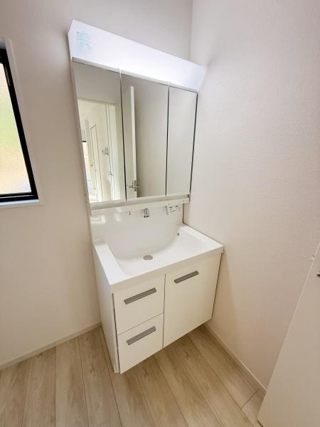 【独立洗面台】シンプルで清潔感のある洗面台が設置されています。鏡面収納が備わっており小物の整理も便利です。明るい空間で朝の身支度も快適に行えます。窓から自然光が差し込む設計です。