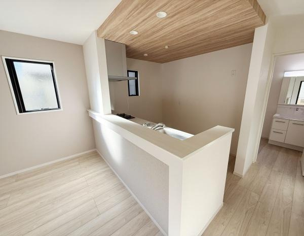 【キッチン】木目調の天井が印象的なキッチンです。窓から自然光が入り明るい雰囲気になっています。対面式のカウンターで開放感があります。白を基調とした空間がすっきりとしています。隣室との動線もスムーズです。