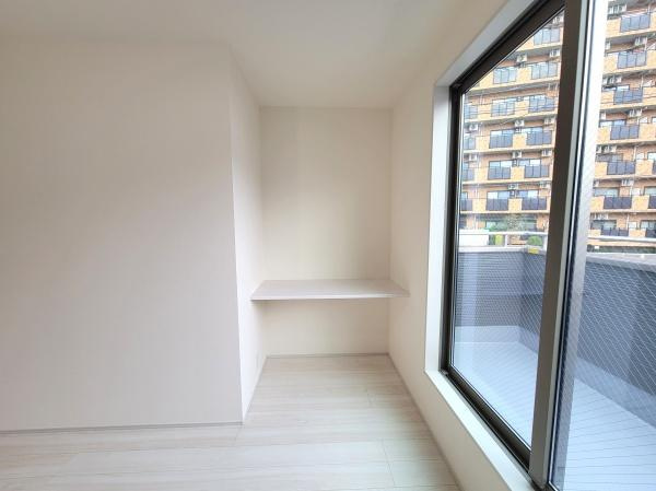 【洋室】大きな窓から光が差し込む明るい洋室です。白を基調とした清潔感のある内装が魅力です。シンプルな形状で自由なレイアウトを楽しめます。収納やワークスペースの配置もしやすい空間です。