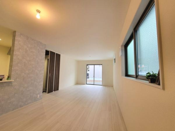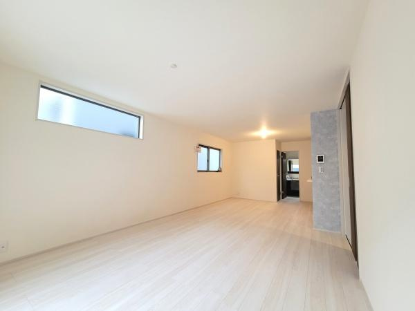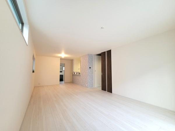 【居間・リビング】落ち着いた色合いの床が室内を明るく見せます。広々としたリビング空間で開放感があります。窓からの採光が十分に確保されています。シンプルな内装で様々なインテリアにも調和します。