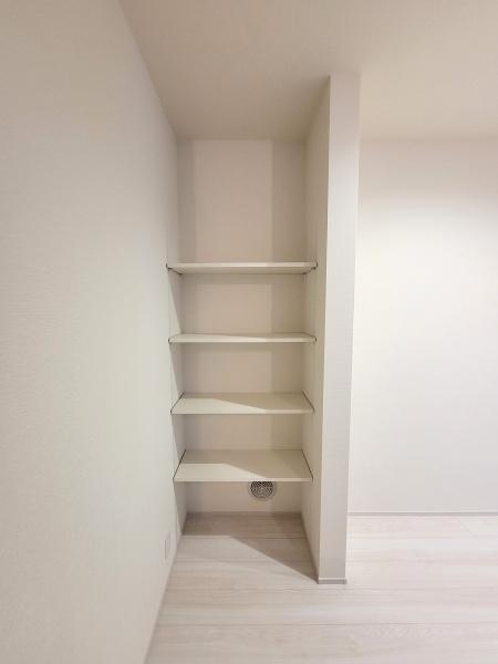 【収納】壁面を有効活用した棚付きの収納スペースです。シンプルなデザインで整理がしやすく空間を広々と使うことができます。奥行きのある設計なのでさまざまなアイテムを置いてもすっきりと収まります。