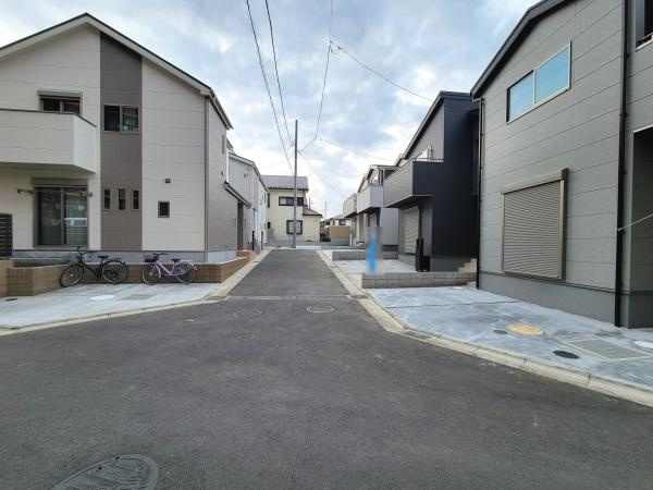 【前面道路含む現地写真】落ち着いた雰囲気の住宅街に位置しています。前面道路が広く車の出入りもスムーズです。周囲には新しい住宅が並び統一感があります。歩道部分も整備されており安心してご利用いただけます。