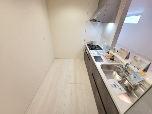【キッチン】シンプルなデザインでお手入れがしやすいキッチンです。収納が豊富でスッキリと使えます。作業スペースも確保されているため日々の調理が快適に行えます。換気設備も配置されており使用時も安心です。
